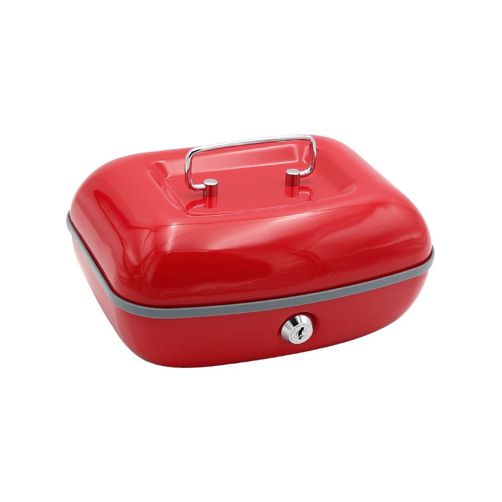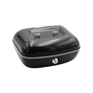 Uzamykateľná pokladňička vyrobená z kvalitnej ocele, s vyklápacím chrómovým madlom na ľahké prenášanie. vnútro obsahuje vyberateľný plastový mincovník / šesť priehradok pod mincovníkom je priestor na bankovky 2 kľúče hmotnosť: 870g farba: čierna matná