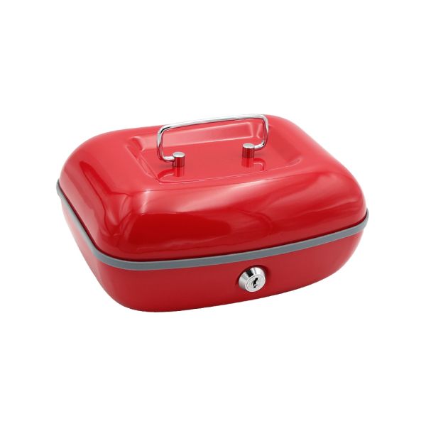 Uzamykateľná pokladňička vyrobená z kvalitnej ocele, s vyklápacím chrómovým madlom na ľahké prenášanie. vnútro obsahuje vyberateľný plastový mincovník / šesť priehradok pod mincovníkom je priestor na bankovky 2 kľúče hmotnosť: 1,14 kg farba: čierna matná