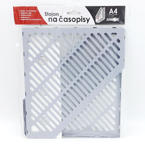 Plastový/bielo-šedý kancelársky stojan na časopisy, ktorý je rozložiteľný. Balené v závese.
