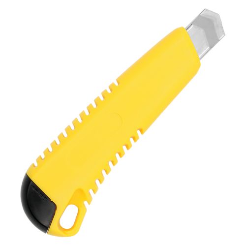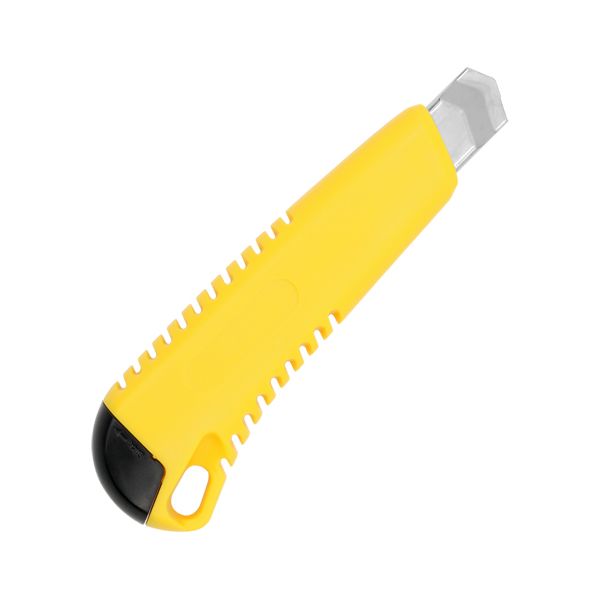 Veľký orezávací nož s manuálne nastaviteľnou vysúvacou čepeľou šírky 18 mm z ušľachtilej ocele, telo noža z kvalitného PVC žltej farby. Vhodný na reklamné účely. Vhodný na potlač. Voľne balené 48ks. Rozmer: 150x10x40mm.