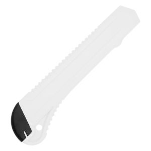 Veľký orezávací nož s manuálne nastaviteľnou vysúvacou čepeľou, šírky 18 mm z ušľachtilej ocele, telo noža z kvalitného PVC bielej farby. Vhodný na reklamné účely. Vhodný na potlač. Voľne balené 48ks.Rozmer: 150x10x40mm.