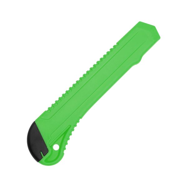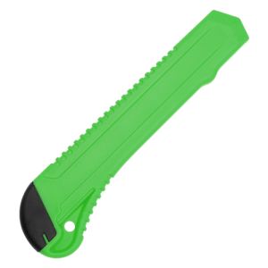 Veľký orezávací nož s manuálne nastaviteľnou vysúvacou čepeľou šírky 18 mm z ušľachtilej ocele, telo noža z PVC zelenej farby. Vhodný na reklamné účely. Vhodný na potlač. Voľne balené 48ks.Rozmer: 150x10x40mm.