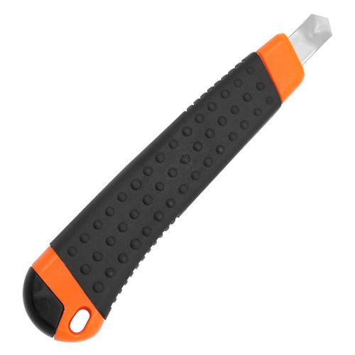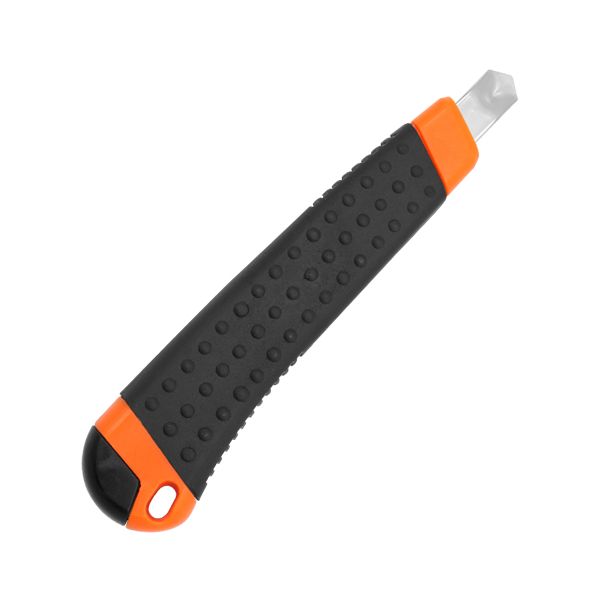 Orezávací nôž malý s pogumovanou rúčkou, s nastaviteľnou vysúvacou a olamovacou čepeľou. Rozmer: 140x30x13 mm. Čepeľ má 9 mm.