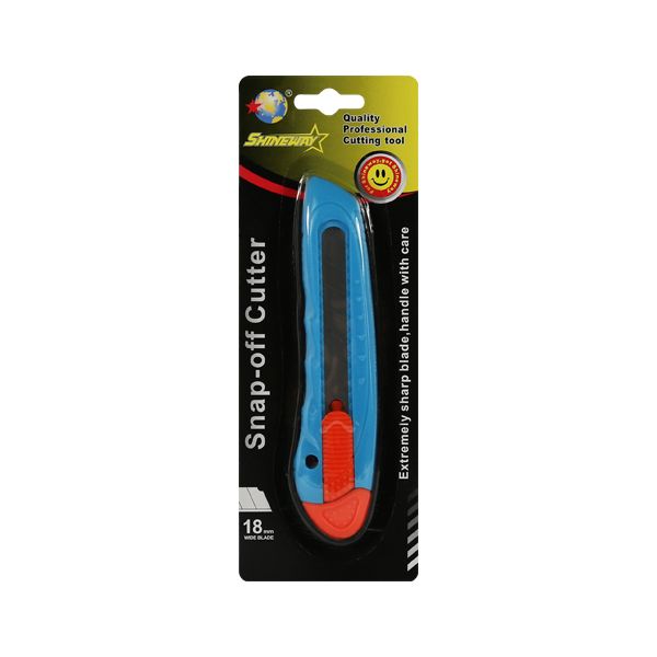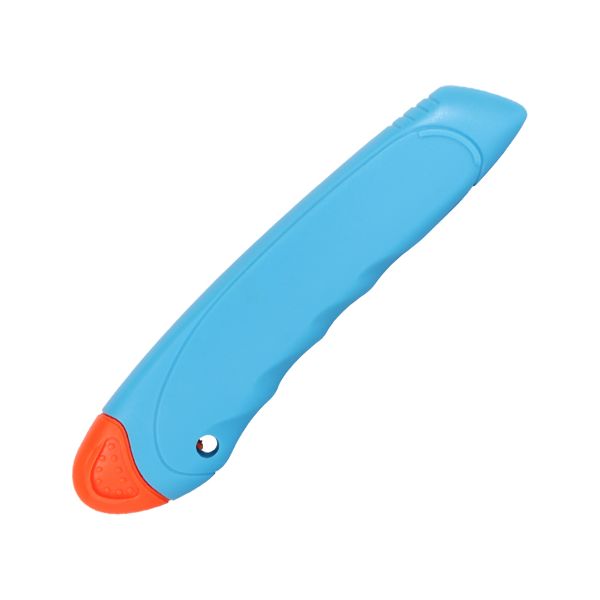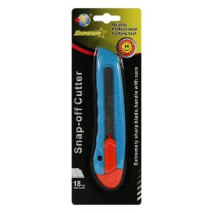 Veľký orezávací nož s manuálne nastaviteľnou vysúvacou čepeľou šírky 18 mm z ušľachtilej ocele, telo noža z PVC modrej farby. Vhodný na reklamné účely. Vhodný na potlač. Voľne balené 48ks. Rozmer: 150x10x40mm.