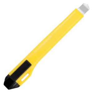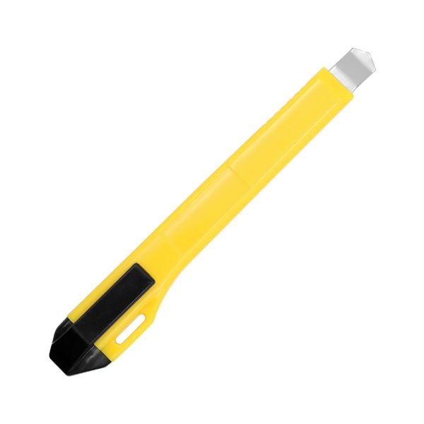 Malý orezávací nôž s odlamovacou čepeľou, vysúvací pomocou polohovacieho jazdca so zarážkami z ušľachtilej ocele, telo noža a vysúvací mechanizmus je z kovu.