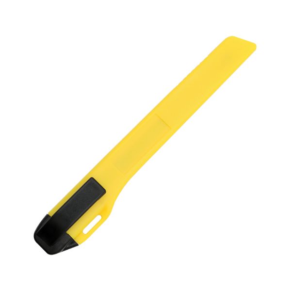 Veľký orezávací nož s manuálne nastaviteľnou vysúvacou čepeľou šírky 18 mm z ušľachtilej ocele, telo noža z kvalitného PVC žltej farby. Vhodný na reklamné účely. Vhodný na potlač. Voľne balené 48ks. Rozmer: 150x10x40mm.