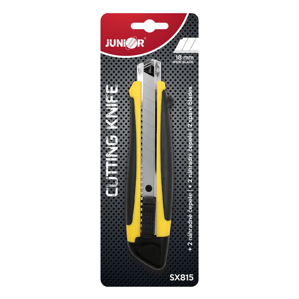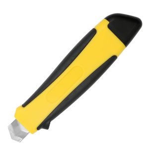 Veľký orezávací nož s manuálne nastaviteľnou vysúvacou čepeľou šírky 18 mm z ušľachtilej ocele, telo noža z kvalitného PVC žltej farby. Vhodný na reklamné účely. Vhodný na potlač. Voľne balené 48ks. Rozmer: 150x10x40mm.