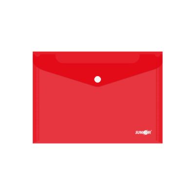 Obal na dokumenty A6 so zapínaním na patentku, vyrobený z kvalitného priehľadného PP materiálu. Farba: červená.