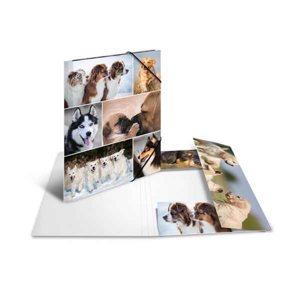 Doska s gumičkou s motívom psov vhodná na uskladnenie dokumentov, výkresov, učebníc či zošitov, ktoré vďaka pevnému telu dosky budú chránené pred poškodením.
