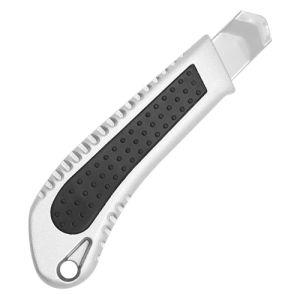 Veľký orezávací nož s manuálne nastaviteľnou vysúvacou čepeľou, šírky 18 mm z ušľachtilej ocele, telo noža z kvalitného PVC bielej farby. Vhodný na reklamné účely. Vhodný na potlač. Voľne balené 48ks.Rozmer: 150x10x40mm.