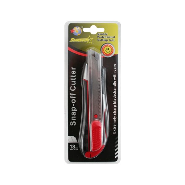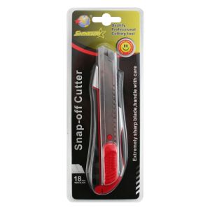 Veľký orezávací nož s manuálne nastaviteľnou vysúvacou čepeľou šírky 18 mm z ušľachtilej ocele, telo noža z kvalitného PVC červenej farby. Vhodný na reklamné účely. Vhodný na potlač. Voľne balené 24ks. Rozmer: 150x10x40mm.