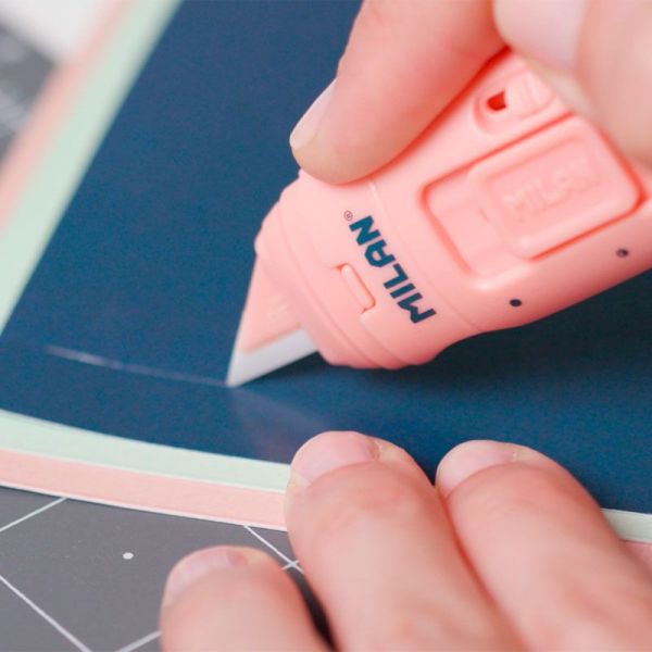 Malý orezávací nôž s odlamovacou čepeľou, vysúvací pomocou polohovacieho jazdca so zarážkami z ušľachtilej ocele, telo noža a vysúvací mechanizmus je z PVC.