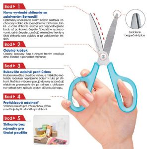 Školké nožnice s ergonomickou rukoväťou v troch pestrých farbách. Rukoväť je vyrobená z tvrdého ale zároveň na dotyk príjemného materiálu.Čepeľ nožníc je vyrobená z kvalitnej nerezovej ocele, pričom koniec čepele je zaoblený.