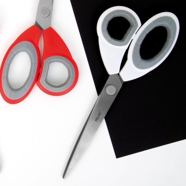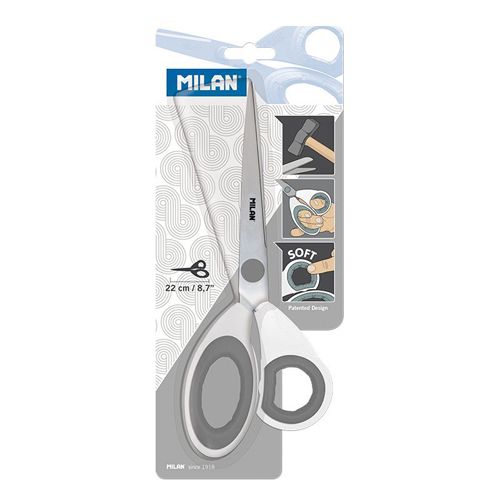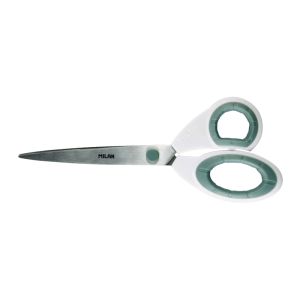 Blistrové biele kancelárske nožnice 22 cm. Kancelárske nožnice s čepeľou z nehrdzavejúcej ocele. Biele plastové držadlo so šedými detailmi, odolné voči nárazom a ergonomické uchopenie. Nožnice MILAN väčší rozmer: 22 cm.