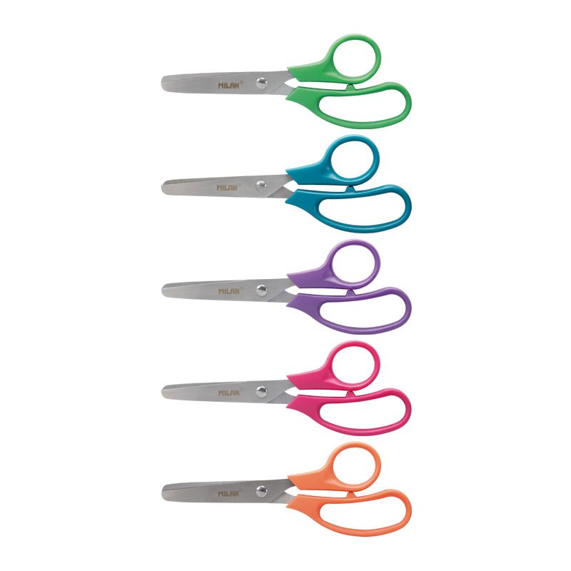 Nožnice MILAN Basic s čepeľou z nehrdzavejúcej ocele so zaoblenou špičkou. Plastová rukoväť. Ideálne pre použitie v škole. Farba zelená. 13,3 cm. Balenie: blister.