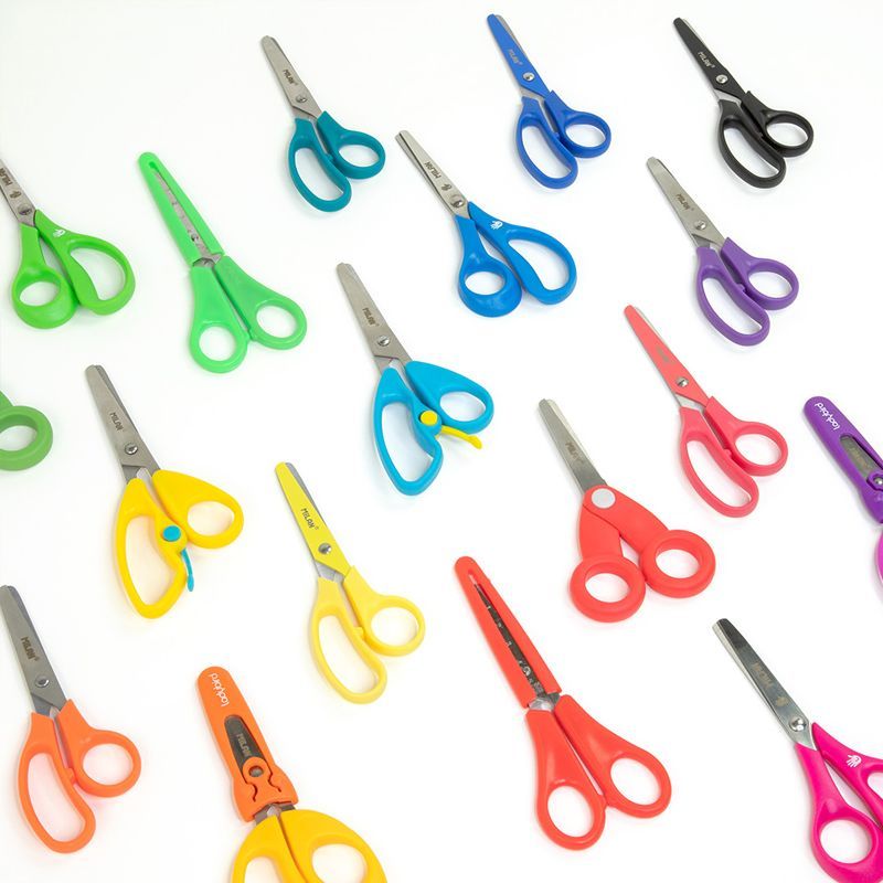 Školké nožnice s ergonomickou rukoväťou v troch pestrých farbách. Rukoväť je vyrobená z tvrdého ale zároveň na dotyk príjemného materiálu.Čepeľ nožníc je vyrobená z kvalitnej nerezovej ocele, pričom koniec čepele je zaoblený.
