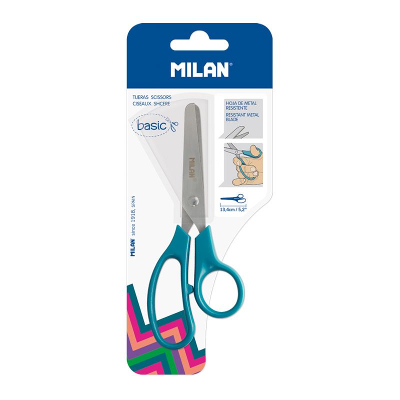 Nožnice MILAN Basic s čepeľou z nehrdzavejúcej ocele so zaoblenou špičkou. Plastová rukoväť. Ideálne pre použitie v škole. Farba zelená. 13,3 cm. Balenie: blister.