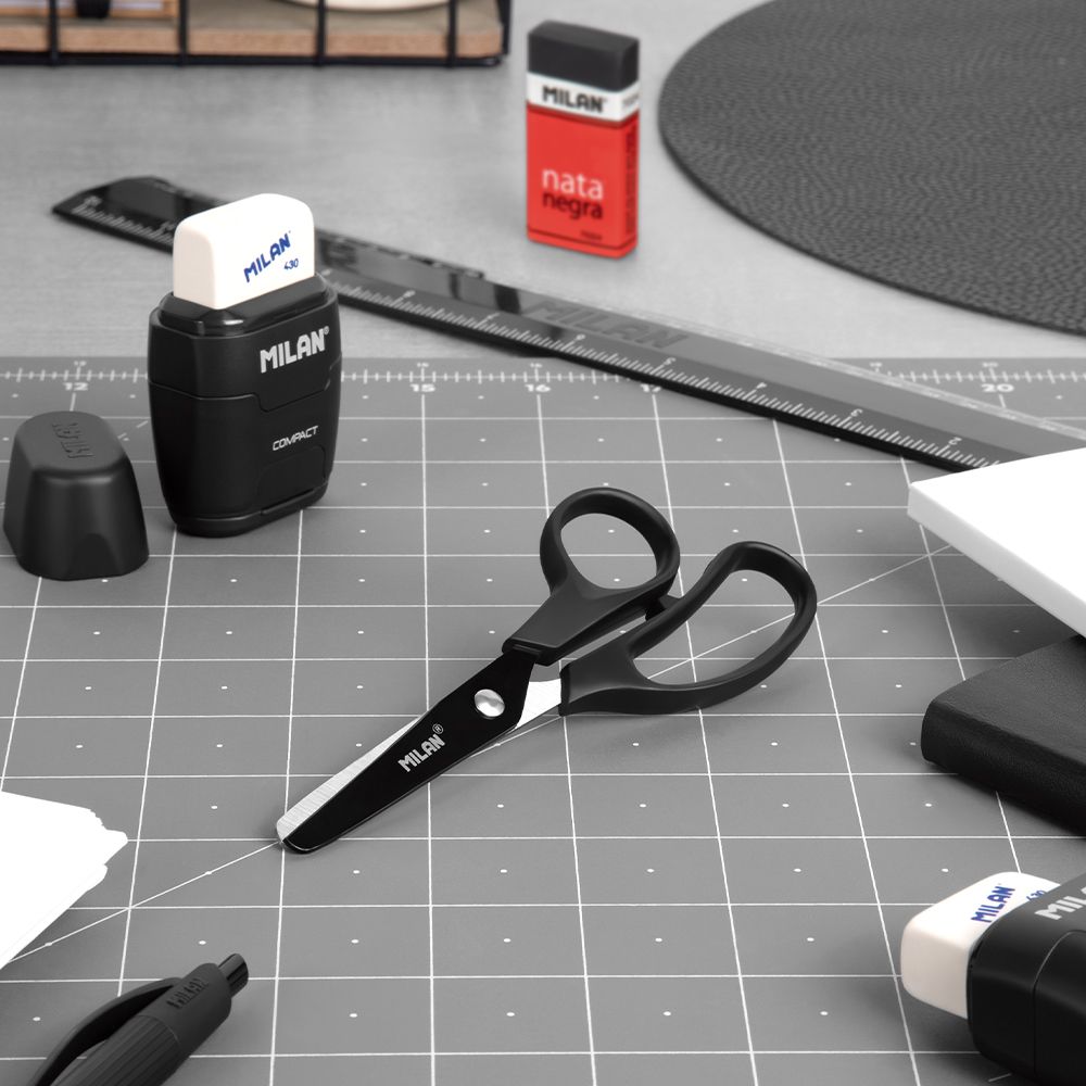 Nožnice MILAN Basic s čepeľou z nehrdzavejúcej ocele so zaoblenou špičkou. Plastová rukoväť. Ideálne pre použitie v škole. Farba zelená. 13,3 cm. Balenie: blister.