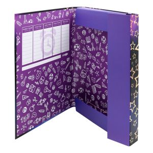 Box na zošity formát Jumbo A4, zatváranie na gumičku. Výhodou sú 3 chlopne z tvrdeného kartónu, ktoré chránia zošity a knihy proti poškodeniu. Odolný, kvalitný materiál. Nevyhnutná súčasť vybavenia každého školáka na uloženie zošitov a kníh.