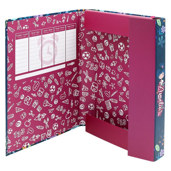 Box na zošity formátu A5 Jumbo so zatváraním na gumičku. Nevyhnutná súčasť vybavenia každého školáka na uloženie zošitov a kníh. vnútorné tri chlopne chránia zošity a knihy proti poškodeniu materiál: odolný, pevný kartón s potlačou vnútorná šírka chrbta: 3 cm