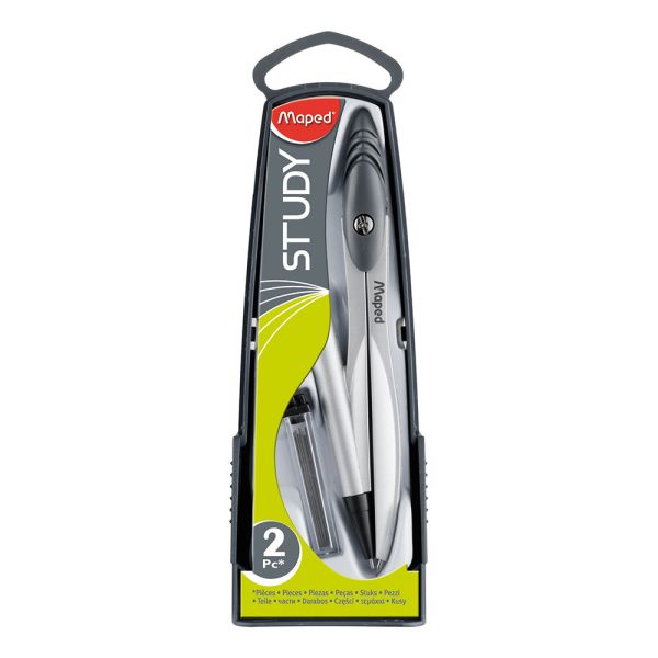 Školské kovové kružidlo s ohybným ramenom, s čiernym plastovým úchytom. Súčasťou balenia je náhradná tuha. Celý set je balený v praktickej plastovej krabičke.