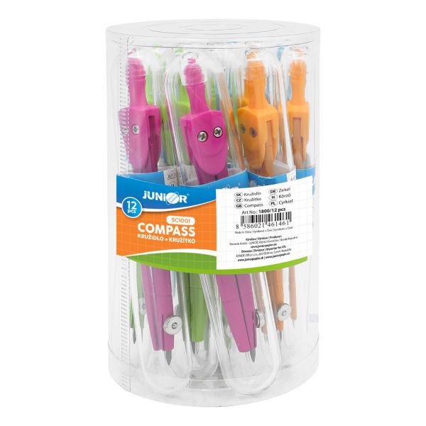 Kovové školské kružidlo od značky JUNIOR, s plastovým úchopom. Bez ohybného ramena, celé jeho telo je pevné. Zabalené je v praktickej plastovej krabičke. Predáva sa v štyroch žiarivých farbách, akými sú ružová, modrá, zelená a žltá.