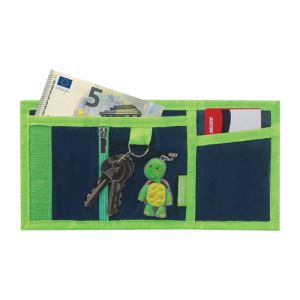 Detská peňaženka so šnúrkou a zapínaním na suchý zips. Vnútro obsahuje: prepážku na bankovky kapsu na mince so zipsom prepážka na kartičky krúžok na kľúče priehľadná PVC kapsa so zapínaním na zips na zadnej strane peňaženky Dĺžka šnúrky: 40 cm Materiál: 100 % polyester.
