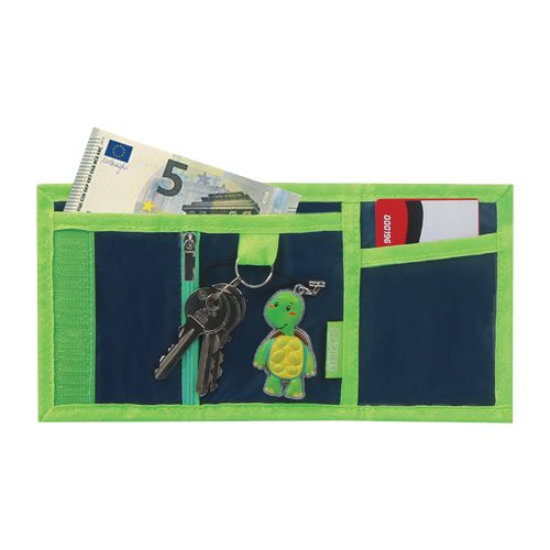 Detská peňaženka so šnúrkou a zapínaním na suchý zips. Vnútro obsahuje: PVC okienko, krúžok na kľúče, 1 vnútornú priehradku na zips a zasúvaciu priehradku, 1 vonkajšie PVC okienko so zapínaním na zips. Rozmery: 12,5 x 8,5 cm (zložené) a pútko 40 cm. Materiál: 100 % polyester.