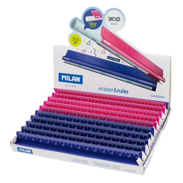 Guma + pravítko. Meranie na oboch stranách, 15 cm. Vo vnútri pravítka je zahrnutá guma MILAN. Kovové pravítko. Tri rôzne farby: modrá, červená a šedá.