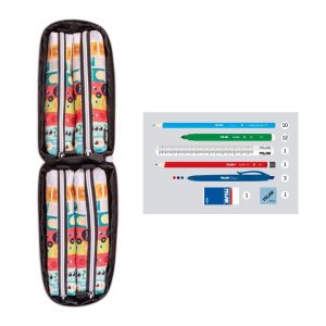 2. puzdro obsahuje volne ložené farebné perá 3 ks, ceruzku HB a pravítko s trojuholníkovým telom