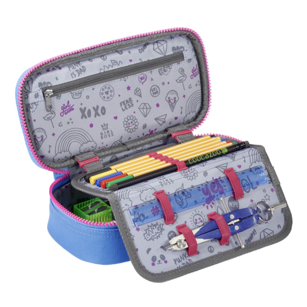 1 - zipsový peračník oválneho tvaru vo vnútri obsahuje: chlopňu s 5 pútkami na farbičky, fixy, ceruzky veľký priestor pre volne ložené školské a písacie potreby Materiál: Polyester