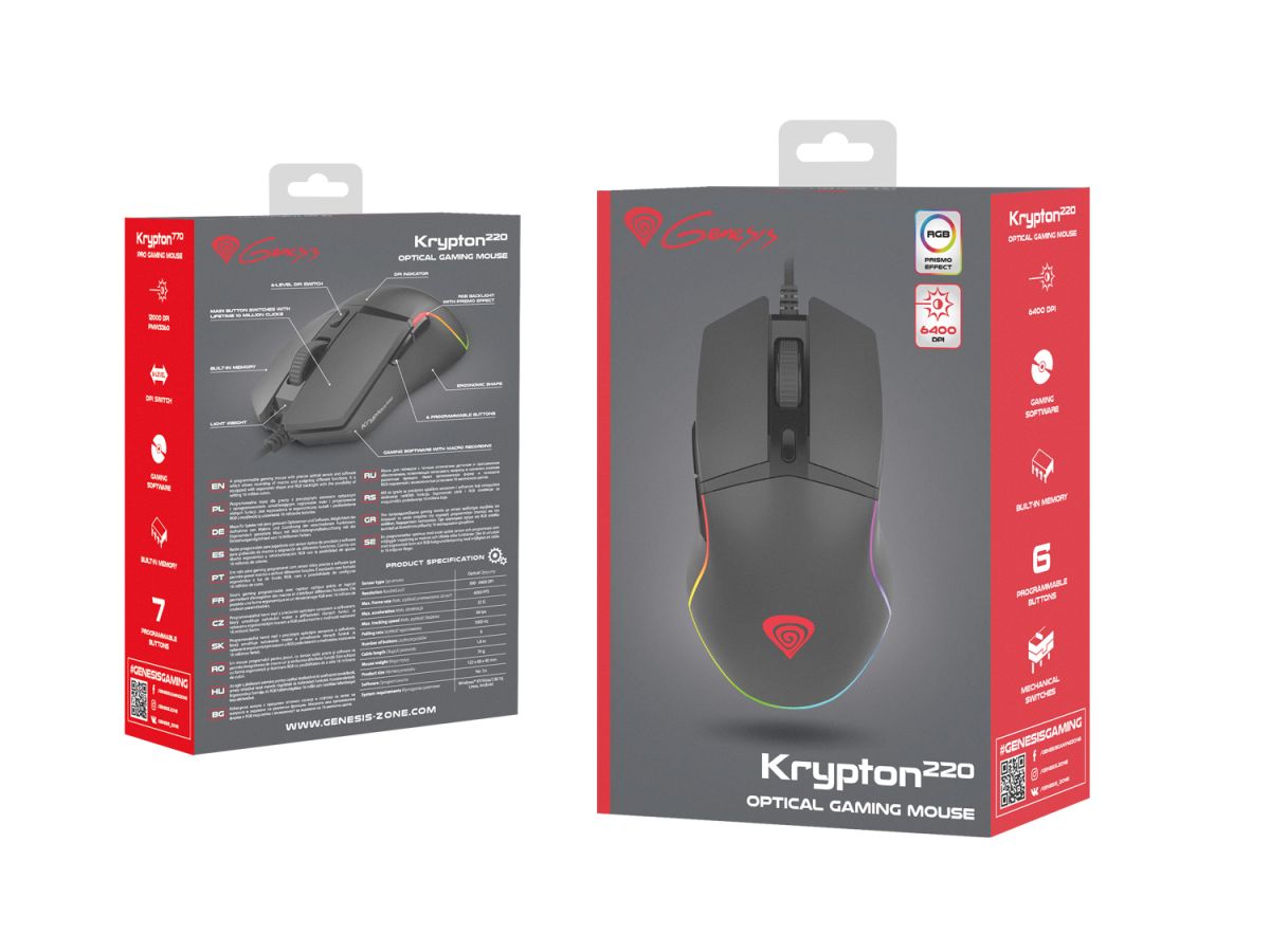 Krypton 220 je ľahká herná myš s presným optickým snímačom a specializovaným softvérom, ktorý umožňuje nahrávať makrá a priraďovať tlačidlám rôzne funkcie. Ergonomický dizajn poskytuje skvelé pohodlí a pôsobivé podsvietenie RGB s efektom PRISMO vám umožní vytvoriť jedinečnú hernú stanicu. Hlavné spínače so životnosťou až 10 miliónov kliknutí zaistia, že vás myš bude doprevádzať nespočetným množstvom hier.