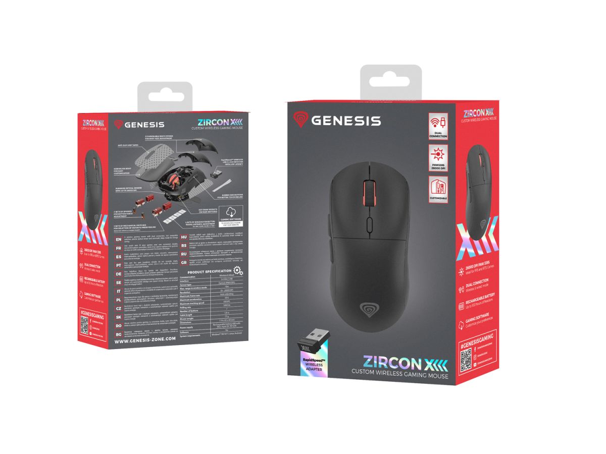 Zoznámte sa s jednou z najpokročilejších myší na trhu. Predstavujeme vám GENESIS Zircon XIII s konštrukciou ponúkajúcou všetko, čo skutočne potrebujete. Plné prispôsobenie hardvéru (vymeniteľné spínače, vzdialenosti, pružiny), jeden z najlepších snímačov na svete (Pixart PAW3395) a technológie bezdrôtového pripojenia (RapidSpeed™ Wireless) pre skutočne drôtový výkon, a to nie je všetko. S GENESIS Zircon XIII hra ešte len začína.