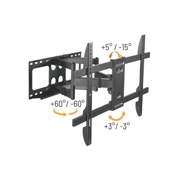 TB držiak televízora TB-63P 32-70" 55 kg max. VESA 600x400 Použitie: TV Typ: montáž na stenu Minimálny rozmer TV: 32" Maximálny rozmer TV: 70" VESA: *200x200 *400x200 *400x400 *600x400 Maximálna záťaž: 55 kg Vertikálne prispôsobenie: 15° Rozsah: 60-440 mm Uchytenie do rohu: nie Farba: čierna