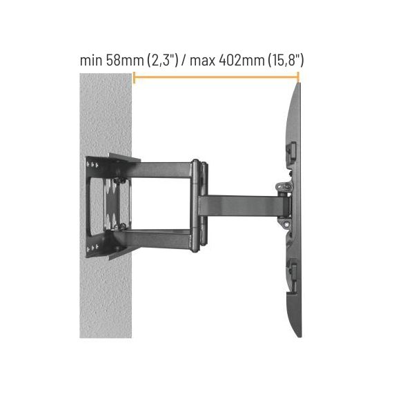 Výsuvný nástenný držiak LPA69-466 je určený na inštaláciu TV s plochou obrazovkou s uhlopriečkami od 37“ do 80“. Jeho najväčšia prednostná je robustná výsuvná heavy-duty konštrukcia, vďaka ktorej unesie TV s hmotnosťou až 60 kg a zároveň umožňuje nastaviť vzdialenosť TV od steny v rozsahu 58 mm až 402 mm, samozrejmosťou je potom aj veľký rozsah polohovania. Držiak umožňuje ľahké naklápanie TV v rozsahu +5°-15°, natočenie do strán v rozsahu +60°-60° a rotáciu v rozsahu +3°-3°, čo maximalizuje flexibilitu sledovania z ľubovoľného miesta v miestnosti. Integrovaná svorka na káble udržuje káble usporiadané a chránené.