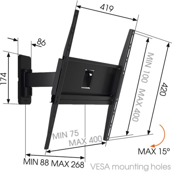 Screen size (min) 30" Screen size (max) 70" VESA *200 x 200 *400 x 200 *400 x 400 *600 x 400 Nosnosť (max.) 35 kg Vertikálne nastavenie 20° Nastavenie rozsahu Áno Dosah (min.) 79 mm Dosah (max.) 427 mm Čierna farba