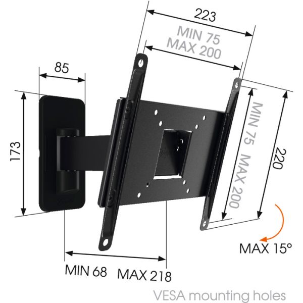 Univerzálny držiak s dvojitým ramenom Hlavné vlastnosti: - maximálny pomer výkon/cena - nosnosť 15 kg - 3 kĺby, nastaviteľný náklon 0-15 stupňov - univerzálne uchytenie 75x75, 100x100, 200x100 a 200x200 - všetok potrebný montážny materiál je súčasťou balenia