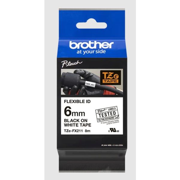 Ideálne na vytváranie identifikačných štítkov pre káble, vodiče, PVC trúbky alebo iné valcovité tvary. Špeciálne lepidlo pásky Brother TZe-FX211 s černým tlačou na bielom podklade zaisťuje, že vaše dôležité štítky budú mať dlhú životnosť. Kompatibilný s tlačiarňami štítkov P-touch, ktoré majú logo TZ alebo TZe na kryte kazety s páskou.