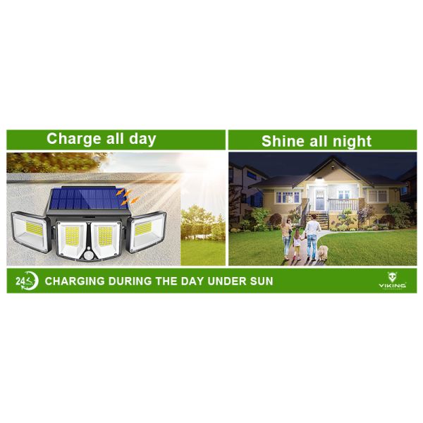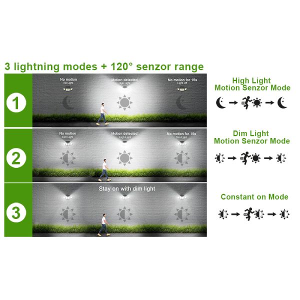 Batéria v solárnom svetle poskytuje dostatočný výkon pre celonočné osvetlenie. Doba svitu záleží na intenzite svetla. Podľa vybraného svetelného režimu vám LED svetlo vydrží svietiť 8-12 hodín. Vstavaný pohybový senzor detekuje pohyb v rozmedzí od 3 do 5 m v pozorovacom uhle 120 ° a zároveň dokáže rozpoznať falošný pohyb (pohyb vetví, vítor, atď.)