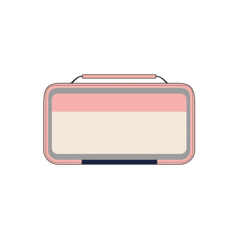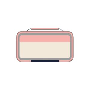 Vo vnútri je obdĺžnikový desiatový box s ružovým vekom a modrou rukoväťou.