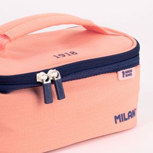 Izotermická taška na potraviny - špeciálna séria 1918 tmavomodrej farby. Vo vnútri je obdĺžnikový desiatový box s modrým vekom a rukoväťou. V hornej časti je integrovaná kapsa so zipsom. Úplné otváranie pre lepšiu dostupnosť a čistenie. Textilné zloženie: polyesterová vonkajšia tkanina "Ripstop" (ľahká a odolná voči roztrhnutiu) a izotermická vnútorná podšívka (PEVA) Objem: 1,5 litra.