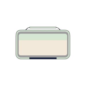 Vo vnútri je obdĺžnikový desiatový box s ružovým vekom a modrou rukoväťou.