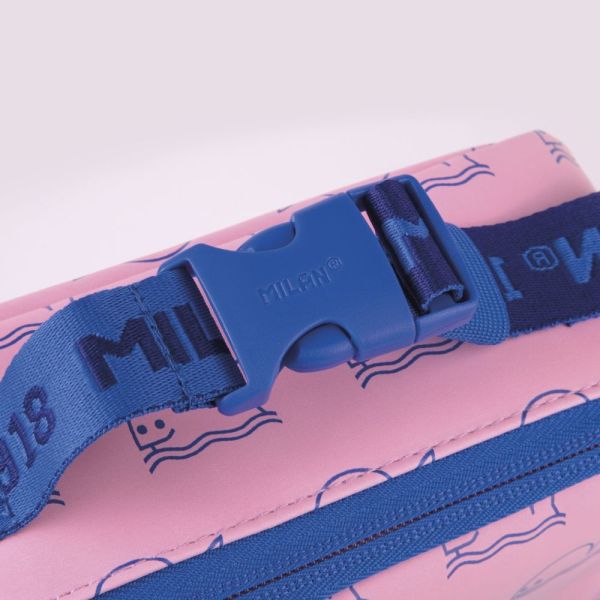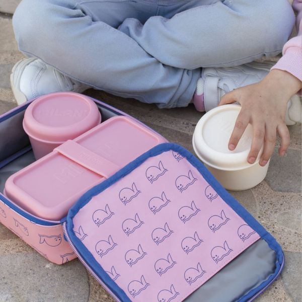 Izotermická taška na potraviny - špeciálna séria 1918 ružovej a tmavomodrej farby. Vo vnútri je obdĺžnikový desiatový box s ružovým vekom a modrou rukoväťou. V hornej časti je integrovaná kapsa so zipsom. Úplné otváranie pre lepšiu dostupnosť a čistenie. Textilné zloženie: polyesterová vonkajšia tkanina "Ripstop" (ľahká a odolná voči roztrhnutiu) a izotermická vnútorná podšívka (PEVA) Objem: 1,5 litra.