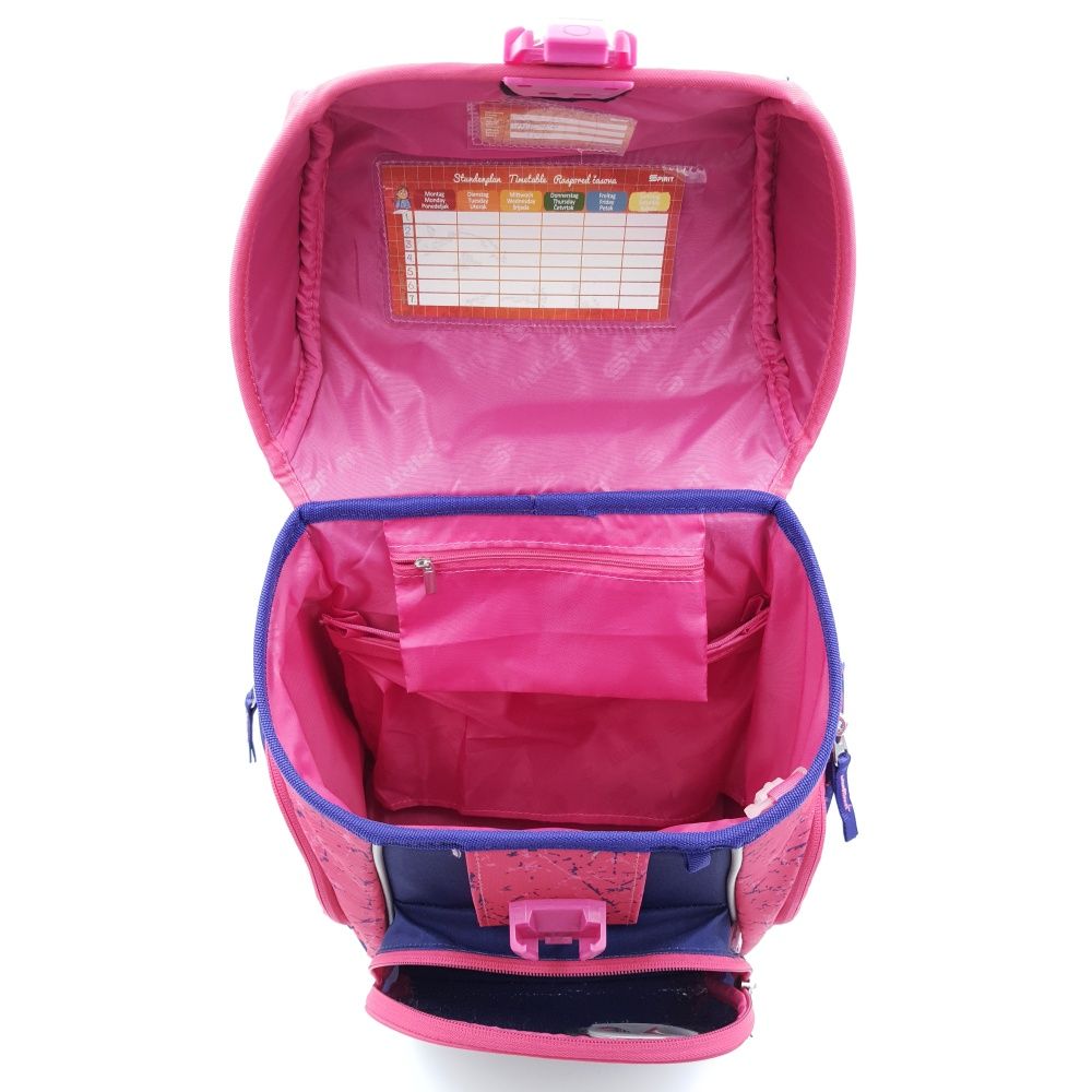 do hlavného úložného priestoru sa zmestia A4 zošity, knihy + vo vnútri sú dve priehradky s gumičkou a menšia kapsa na zip