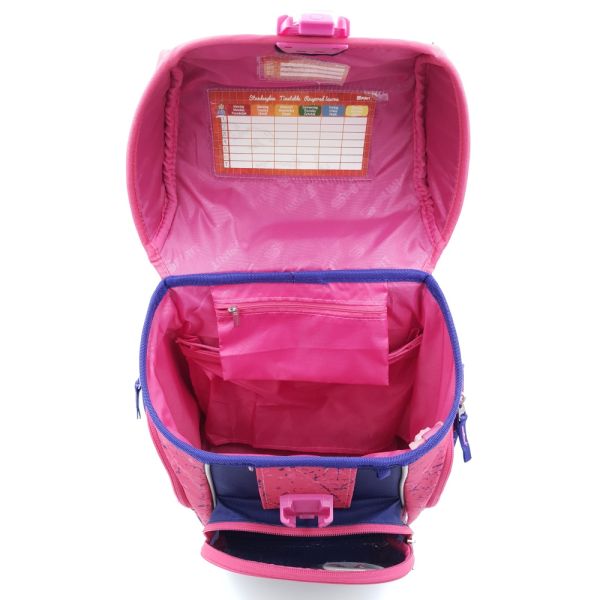 Sada obsahuje: školskú tašku, vrecko na prezúvky, naplnený peračník, puzdro na perá, peňaženku a 3 meniace kartičky s obrázkami na prednom vrecku.