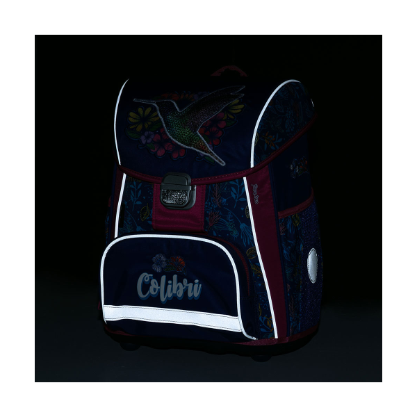 Zapínanie je na bezpečnostnú pracku. Predné vrecko je určené na desiatu, nechýba rad reflexných prvkov pre bezpečnosť za zníženej viditeľnosti.