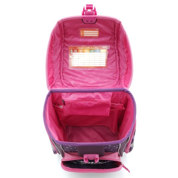 priestranný úložný priestor, kde pohodlne uložíte A4 zošity, knihy - vo vnútri sú dve priehradky s gumičkou a menšia kapsa na zip