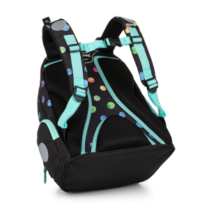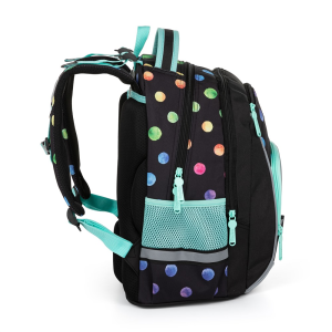 Školský plecniak 5-zipsový vhodný pre školáčky na druhom stupni a tiež na voľnočasové aktivity. Priestor: hlavná komora s polstrovanou prepážkou na notebook do 15'' predná veľká komora bez prepážok menšie a väčšie vrecko na zips v prednej časti batohu kapsička so zipsom na chlopni pod ktorú sa dá pripnúť mikina, sveter nechýbajú bočné vrecká na fľašu Vlastnosti: 3D materiál s bodkami nastaviteľné polstrované ramenné popruhy polstrovaná rukoväť na pohodlné prenášanie sieťovaná látka na chrbtovej stene pre lepšiu cirkuláciu vzduchu do batohu sa pohodlne zmestia všetky zošity a pracovné materiály Hmotnosť: 540 gMateriál: 100% Polyester