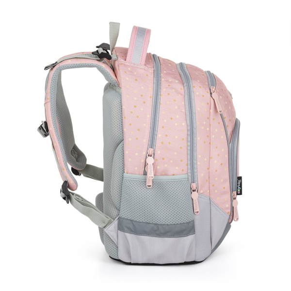 Školský plecniak 5-zipsový vhodný pre školáčky na druhom stupni a tiež na voľnočasové aktivity. Priestor: hlavná komora s polstrovanou prepážkou na notebook do 15'' predná veľká komora bez prepážok menšie a väčšie vrecko na zips v prednej časti batohu kapsička so zipsom na chlopni pod ktorú sa dá pripnúť mikina, sveter nechýbajú bočné vrecká na fľašu Vlastnosti: 3D materiál s bodkami nastaviteľné polstrované ramenné popruhy polstrovaná rukoväť na pohodlné prenášanie sieťovaná látka na chrbtovej stene pre lepšiu cirkuláciu vzduchu do batohu sa pohodlne zmestia všetky zošity a pracovné materiály Hmotnosť: 540 gMateriál: 100% Polyester
