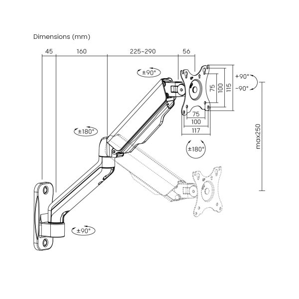 Nástenný držiak monitora s mechanickou pružinou, ideálny na použitie s rôznymi typmi monitorov, či už pracujete z domu, v kancelárii alebo vo vzdelávacom prostredí. Určený pre jeden monitor s uhlopriečkou 17" až 32" a hmotnosťou až 9 kg. Dosah 450 mm.